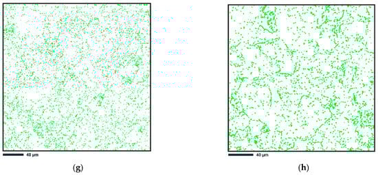 To obtain a more comprehensive characterization of microstructural evolution and changes in grain orientation, EBSD studies were conducted. Figure 9 shows the EBSD maps, where the red lines represent interfaces with a low angle of misorientation (2°–15°), while the green lines represent interfaces with a higher angle of misorientation (>15°).