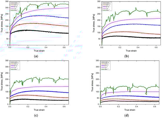 Typical stress–strain curves for the SLM M300 maraging steel obtained from uniaxial compression tests at various strain rates: (a) 900 °C, (b) 1000 °C, (c) 1100 °C, and (d) 1200 °C.