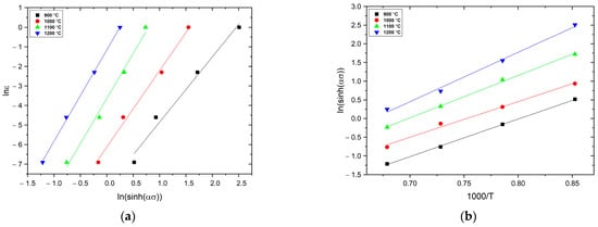 Here, A, n, n1, α, and β are material constants that are independent of temperature and strain rate, and σ (Mpa) is the peak stress. Accordingly, the material constants n1 and β are derived from the slopes of  and , respectively, as shown in Figure 5a,b. Here, n1 and β are calculated as 6.13 and 0.06 Mpa−1, respectively. The adjustable scaling factor α can then be calculated using the following formula α = β/n1, which gives an α-value of 0.0098, Table 3.