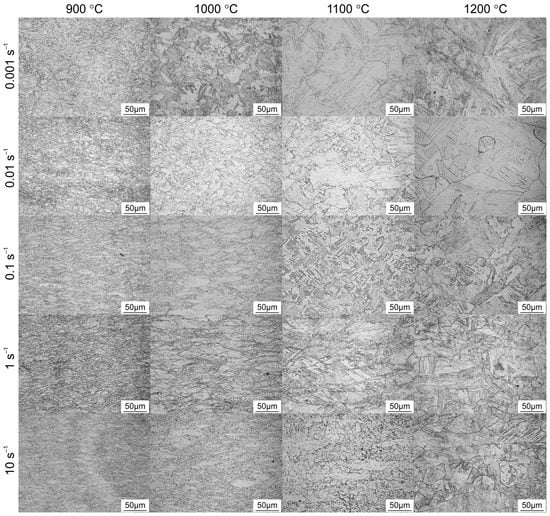 The typical optical microscopic microstructures of the additively manufactured 18Ni-300 maraging steel deformed at different deformation conditions are given in Figure 8. For purposes of comparison, all microstructures were captured at the centre of the cross-section of the deformed specimens, and all micrographs were captured at the same magnification. Each microstructure shows the combined effect of temperature and strain rate at the end of deformation.