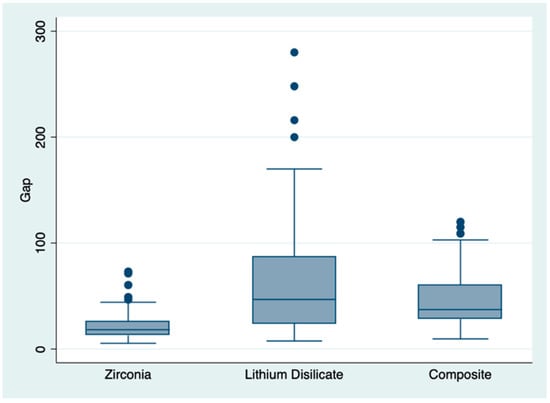 The SEM analysis of marginal gap performed on 324 points (12 for each coping) showed a total mean value of 21.45 ± 12.58 μm for zirconia, 62.28 ± 51.8 μm for disilicate, and 44.7 ± 24.96 μm for composite crowns, with statistically significant differences between the three groups (Table 2). The sample distribution is represented by the boxplot in Figure 7.