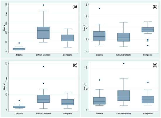 Boxplot representing the sample distribution according to the gap’s location: (a) vestibular gap; (b) palatal gap; (c) mesial gap; and (d) distal gap. Outlier values are indicated by “●” symbols.
