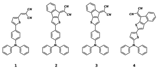 Under bias, the electronic transmission spectrum is usually calculated by using the non-equilibrium Green’s function formalism and the density functional theory using a device model that involves open boundary conditions [12,13,14]. However, the electronic transmission spectrum can be calculated from the electronic band structure for pure phases without bias using a simulation box with periodic boundary conditions. We used this last approach to investigate how the electrical conduction in an organic semiconductor depended on the transport direction. As a model, we used compounds 1 through 4, whose structural formulas are shown in Figure 1. These compounds are push–pull semiconductors composed of a triphenylamine (electron-donor) and dicyanovinyl (electron-acceptor) group. The above compounds were used as electron-donor materials in planar bilayer organic solar cells [15].