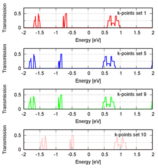 The number of energy levels in the conduction and valence bands will affect the Fermi level position. Moreover, the electronic transmission spectrum may change whether certain energy levels are considered or not for its calculation. Adding more k-points will affect the Fermi level and the transmission spectrum by including new energy levels. Therefore, the relative energy of the Fermi level with respect to the band edges must be converged before computing the transmission spectrum. A large number of k-points sets should be analyzed because the convergence is not variational. In our study, a converged transmission spectrum was achieved with a density of ~52 Å.