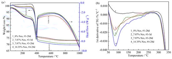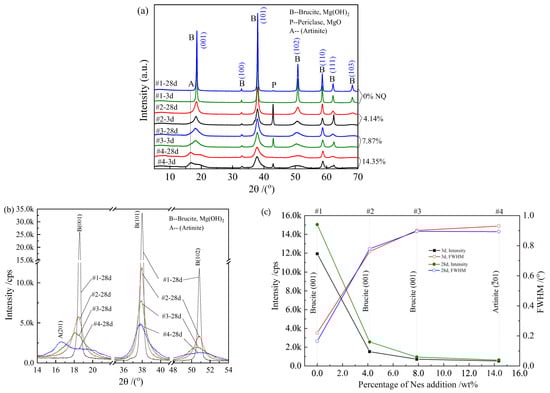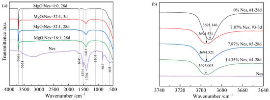 - Compared with the pure MgO sample, the hydration product diffraction peak of the sample with the Nes addition became lower and wider. The crystal structure of the hydration products was similar to that of Mg(OH)2, with a larger d-spacing at the (001), (101), and (102) planes.