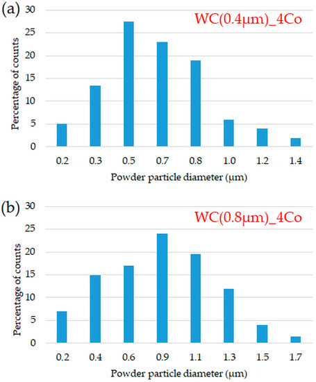 Particle size distribution for sintered WC-4Co for grain sizes of the starting WC powder: (a) 0.4 µm; (b) 0.8 µm.