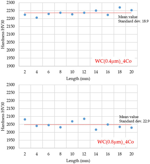 All samples tested had a relative density above 99% of the theoretical density. The Vickers hardness (HV30) of the WC-4Co cemented carbides was measured at room temperature. An example of the hardness profile (the length profile was 20 mm) for the different sample variants is shown in Figure 5. As expected, the hardness of the samples increased with a reduction in WC grain size. The composites produced were homogeneous, as evidenced by the slight deviation from the average hardness value.