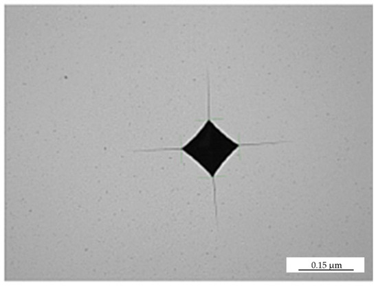 For all sample variants tested, a fracture toughness factor of 8 MPa m1/2 was obtained. Vickers indentations on each sample are presented in Figure 6. It was found that the fracture toughness increases with the slight increase in the WC grain size, as well as the increase in the Co mean free path, which exhibits an inverse tendency as compared with the hardness.