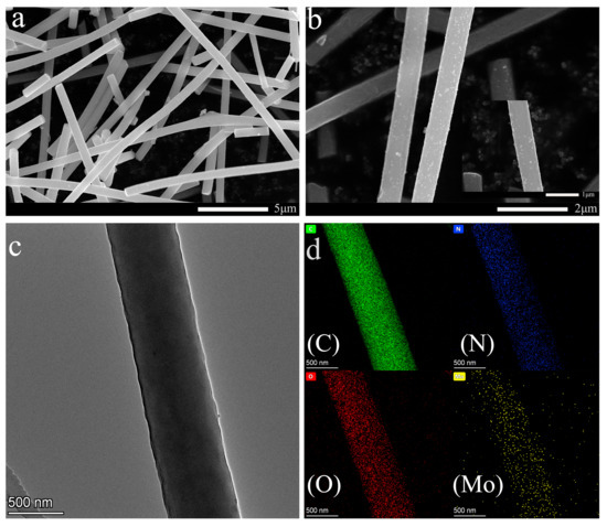 Characterization of Mo-CNFs and CNFs. SEM illustrations of (a) CNFs, (b) Mo-CNF II; (c) TEM image and (d) TEM element mappings of Mo-CNF II.