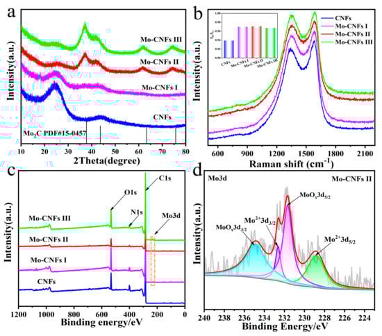 (a) XRD patterns of various Mo-CNFs and CNFs; (b) Raman image (insert is a histogram of ID:IG values); (c) total XPS spectra of CNFs and different Mo-CNF composites; (d) high-resolution Mo 3d XPS spectrum of Mo-CNF II.