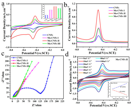 Electrochemical behavior of Mo-CNF and CNF electrodes in 0.1 M PBS containing 2 μM FMN. (a) CVs (30 mV·s−1, insert: histogram of redox peak current density). (b) DPV curves. (c) Nyquist curves. (d) CV curves and peak current density at various scan rates of the Mo-CNF ΙΙ electrode.