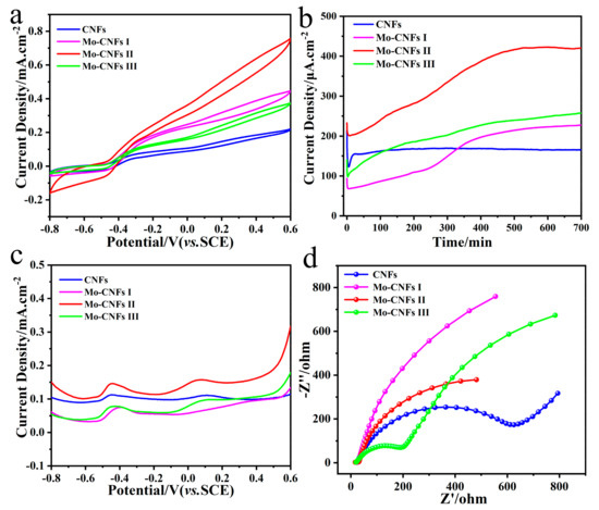 The surface properties and crystal structure of the materials were characterized using XPS, Raman spectroscopy, and XRD. In the XRD spectrum (Figure 2a), two broad peaks at 25° and 43° were found for CNFs that were identified as graphitized carbon peaks [21]. The positions and relative intensities of the characteristic diffraction peaks in the Mo-CNFs were in good agreement with the PDF cards (PDF #15-0457), indicating that Mo was present in the carbon nanowires in the form of Mo2C. In addition, the characteristic peaks in Mo-CNF Ι were not obvious, probably because the Mo content was too small. The Raman analysis of Mo-CNF and CNF electrodes is shown in Figure 2b. The obvious peaks that existed at 1350 and 1580 cm−1 for all electrodes corresponded to the D and G peaks of the carbon material, respectively. The ID:IG value is a crucial parameter for determining the degree of lattice collapse and graphitization. Analyzing the statistics showed that the ID:IG values of Mo-CNFs were all higher than those of CNFs (0.94). Furthermore, Mo-CNF ΙΙ had the largest ID:IG value of 0.97. This indicates that there were more lattice defects in Mo-CNF ΙΙ, which allowed for exposing more active centers and increasing electrocatalytic activity. The full XPS spectra in Figure 2c show that the surface of the Mo-CNFs contained four elements, namely, Mo (BE = 232.02 eV), N (BE = 398.03 eV), O (BE = 531.01 eV), and C (BE = 287.01 eV), compared to the surface of CNFs, demonstrating the effective doping of Mo into the carbon nanofibers [22]. Then, the 3d Mo spectrum (Figure 2d) showed that, in Mo-CNF ΙΙ, Mo3d could be divided into four peaks corresponding to MoOx3d3/2 (235 eV), Mo2+3d3/2 (232.63 eV), MoOx3d5/2 (231.67 eV), and Mo2+3d3/2 (228.82 eV) [23,24]. The high-resolution C1s, O1s, and N1s XPS spectra of Mo-CNF II are shown in Figures S1 and S2; the C1s spectrum shows that C1s could be divided into four peaks in Mo-CNF ΙΙ corresponding to C-N (285.47 eV), C-O (286.62 eV), C=O (289.15 eV), and C-C (284.57 eV) [25].