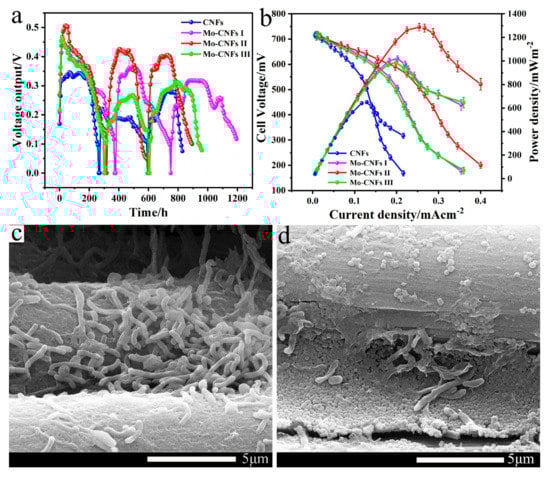 Performance comparison of different electrodes in MFCs. (a) Cyclic discharge curves. (b) Power density and polarization curves. SEM image of bacterial cells grown on (c) Mo-CNF ΙΙ and (d) CNF anode after three-cycle discharge.