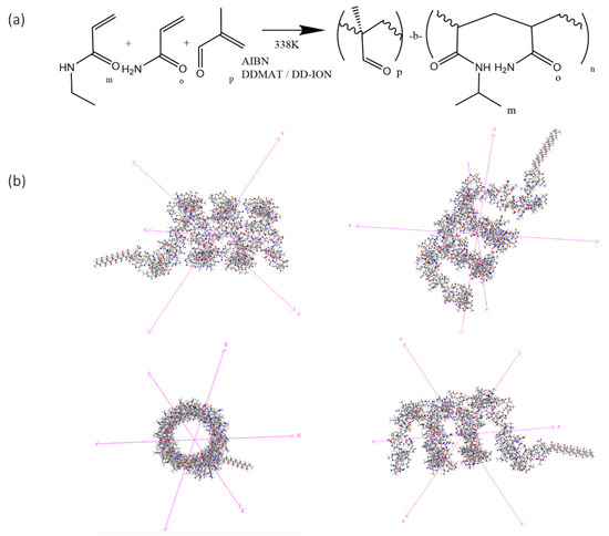 Polymerization synthesis. (a) Process and resulting block structure of the novel copolymer NIPAM–acrylamide–methacrolein. (b) The three-dimensional structure of the synthesized copolymer showing distinct block copolymer regions as viewed along different axes. The methacrolein block and the NIPAM–acrylamide coil structure are visible as two distinct regions.