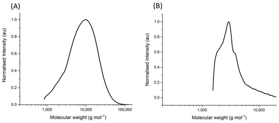 Gel permeation chromatogram of the synthesized copolymer. (A) The molecular weight distribution of NIPAM–acrylamide–methacrolein copolymer synthesized in free solution at a starting molar ratio of 45:45:10, respectively. (B) The molecular weight distribution of the equivalent copolymer synthesized on the surface of SPIONs at a starting molar ratio of 45:45:10, respectively. Molecular weight intensity is normalized to the logarithm of the peak maxima intensities.