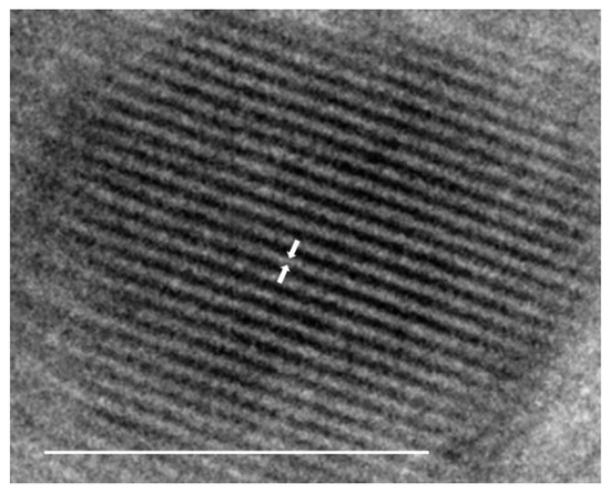 TEM image of spherical SPION core indicating the unit cell spacing. The scale bar is 5 nm, and the arrows indicate a spacing of 4.1 angstroms.