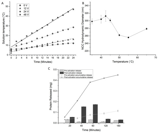 Properties of the NCC. (A) The induction heating rates of the NCC at a concentration of 100 mg/mL observed at differing AC circuit voltages from 0–48 V. (B) The temperature-dependent hydrodynamic diameter of NCC, as measured by dynamic light scattering. Swelling of the complex is observed until an LCST of 42.5 °C is reached, at which the hydrodynamic diameter decreases. (C) The release profile of BSA from protein-loaded NCC. Stimulated and passive releases are shown, as well as cycled and accumulative releases. The protein content was measured by a Bradford protein assay.
