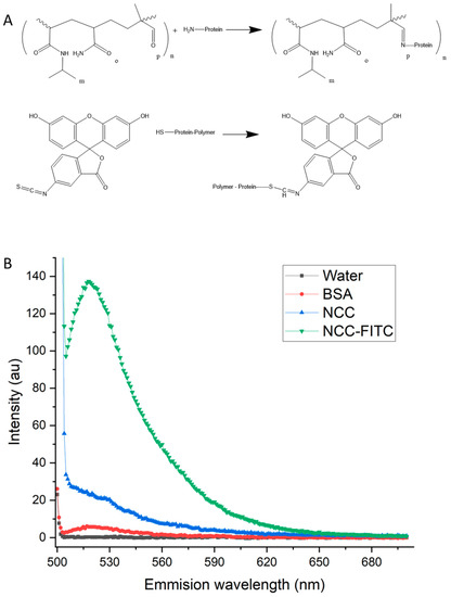 Mechanism and result of FITC binding to the NCC. (A) The reaction scheme detailing protein binding to the copolymer present on the NCC and the subsequent attachment of the fluorophore FITC to the bound protein. (B) The NCC-exhibiting fluorescence signal following binding with FITC. Fluorescence spectrum from 500 to 650 nm of water, 1 mg/mL solution of BSA, NCC, and NCC-FITC. The excitation wavelength of the sample was 495 nm.