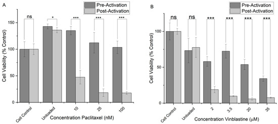 Cell viability was assessed by delivering chemotherapy agents to cells in vitro. The NCC was used to deliver paclitaxel and vinblastine to (A) RD cells, and (B) U-87 MG cells; the x-axis represents concentrations of drugs carried and released by the NCC. Cells refer to the cell-only control and are set to 100%. Unloaded refers to cells incubated with a 2 mg/mL solution of the NCC without bound drugs. All data are scaled as a percentage of cell survival normalized to the cell-only control. Significance was tested using a two-tailed t-test compared between pre- and post-activation for each concentration. P-values assessed between pre- and post-activation are represented as follows *** = p < 0.01, * = 0.5 < p > 0.05, ns = p > 0.5. Bars represent mean +/− standard deviation, n = 3.