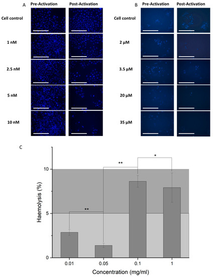 Visual demonstration of selective cell death by the stimulation of the NCC by radio waves. (A) RD cells and (B) U-87MG cells imaged under 495 nm light when stained with Hoechst, after treatment with pre-activation NCC (left), and post-activation NCC (right) at the following concentrations listed vertically downwards; (A) cell control, 1 nM, 2.5 nM, 5 nM, and 10 nM, and (B) cell control, 2 μM, 3.5 μM, 20 μM, and 35 μM. The scale bar is equal to 100 μm. (C) The hemolysis percentages highlighting the biocompatibility of the unloaded NCC. PBS was used as a negative control and water as a positive control to indicate hemolysis. Negligible hemolysis is observed for concentrations from 0.01 to 1 mg/mL ION–polymer. p-values assessed are represented as follows ** = 0.05 < p > 0.01, * = 0.5 < p > 0.05. Bars represent mean +/− standard deviation, n = 3.
