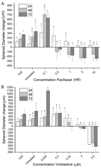 The effect of drug delivery by the NCC on spheroid models. Spheroid diameter changes from t = 0 in the presence/absence of varying concentrations of activated NCC–drug. (A) shows RD spheroid diameter change when paclitaxel is delivered by the NCC, and (B) shows the diameter change for U87-MG cells with the delivery of vinblastine. The change in diameter is shown over a period of 72 h. Diameters were measured using three dimensions of the radius and were performed in triplicate. Cells refer to the cell-only control and are set to 100%. All data are listed as spheroid diameter change in comparison to the diameter at t = 0. Significance was tested using a two-tailed t-test that compared between the sample and the cell control for that time point; a represents a comparison to 24 h, b to 48 h, and c to 72 h. p-values assessed are represented as follows *** = p < 0.01, ** = 0.05 < p > 0.01, * = 0.5 < p > 0.05, ns = p > 0.5. Bars represent mean +/− standard deviation, n = 3.