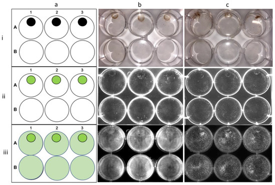 Magnetic localization of the NCC within cells. Demonstration of the magnetic direction ability of NCC in localizing RD cells (column b) and U-87 MG cells (column c) around a permanent magnetic field. (Column a) shows the position of permanent magnets in the plate and the regions of fluorescence. Permanent magnets were placed in wells A1, A2, A3, and B2. NCC-FITC-bearing cells were mixed with control cells in wells A1, A2, A3, and B1. Well B3 contained no NCC-bearing cells and no magnetic field as a control. Row (i) depicts the visible light image of the plate. Row (ii) displays the same plate fluorescently imaged at an excitation wavelength of 495 nm. Row (iii) shows the plate imaged fluorescently as in (ii) but with cell membrane dye present.