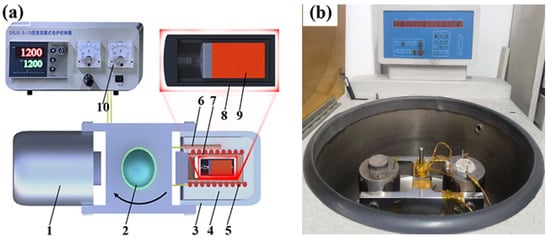 Schematic (a) and image (b) of the centrifugal apparatus: (1) counterweight; (2) centrifugal axis; (3) heating furnace; (4) refractory materials; (5) resistance coil; (6) thermocouple; (7) furnace chamber; (8) graphite and quartz crucible; (9) metal melts and covering slag; (10) temperature controller.