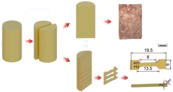 The obtained samples were cut in half along the direction of the SGF, and the cutting face was burnished, polished, and then etched with a solution of 5 g FeCl3 + 50 mL HCl + 100 mL H2O to reveal the structure of the investigated alloys. The grain size of the alloy was obtained by analyzing the images using Image-Pro Plus software. The microstructures of the alloy were analyzed through electron backscatter diffraction (EBSD) using the Symmetry S2 equipment. The electrical conductivity was measured at room temperature using an electrical conductivity tester (AT 510). Using an electronic universal testing machine (WDW-10e), tensile tests were conducted to determine the influence of SGF on the tensile characteristics of the Cu-0.5Sn alloy. The tensile tests were conducted at room temperature at an initial displacement rate of 0.5 mm·min−1, and the specimen is shown in Figure 2.