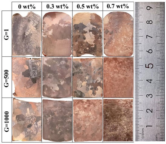 To investigate the effects of Sn content on the solidification structures of refining Cu alloys, experiments were performed using three distinct alloys with Sn weight percentages of 0, 0.3, 0.5, and 0.7, respectively. The Cu alloys were obtained in a normal gravity field at a 10 °C·min−1 cooling rate; as shown in Figure 3, the first line (G = 1) corresponds to Sn contents of 0wt%, 0.3wt%, 0.5wt%, and 0.7wt%, respectively. It can be clearly seen that there was no obvious grain morphology in pure Cu due to the large grain size (Figure 3). With the increase in Sn content to 0.3wt%, the structure exhibited coarse and irregularly shaped grains. Upon further increasing the Sn content to 0.7wt%, the grain size of the samples became more refined. That is to say, the Sn addition played a role in promoting the refinement of grains, which was caused by the fact that as the Sn content increased, both the number of nuclei per unit volume and the nucleation rate increased, and the room available for the growth of each grain became smaller. In a longitudinal comparison, the grain size obviously decreased with the increase in the gravity coefficient. The grains gradually changed from coarse grains to equiaxed grains. Furthermore, it can be seen that the grain refinement effect of SGF was obviously enhanced by the increasing solute Sn concentration. This was due to the fact that the rate of heterogeneous nucleation was increased during the solidification process with the increasing solute Sn content, and dendrites grew much faster. Meanwhile, the convection in the alloy was enhanced by the increased supergravity coefficient. During the process of grain growth, it was easy to be broken to produce new fragments to become a new nucleation. Hence, the enhancement of grain refinement was caused by the increase in solute content in the SGF.
