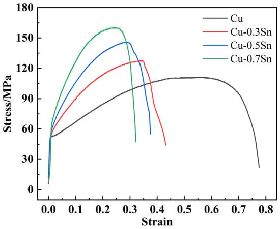 Figure 4 shows the stress–strain curves of Cu alloys with distinct Sn contents, demonstrating that the introduction of Sn increased the strength of pure Cu while reducing its plasticity. This was because the addition of 0.3wt%, 0.5wt%, and 0.7wt% Sn to the Cu matrix metal led to the formation of a solid solution, thereby causing lattice distortion. The interaction between lattice distortion and the elastic field of dislocations restricted the movement of dislocations on the slip plane, resulting in a sharp increase in the strength of Cu-Sn alloys. However, its plasticity was lower than the average value of pure metal. Additionally, the incorporation of Sn atoms led to a significant decrease in alloy conductivity. Because Sn atoms were dissolved in the Cu matrix lattice, the lattice distortion of Cu destroyed the periodicity of the lattice potential field, which increased both the probability of electron scattering and the resistance. Table 1 summarizes the specific experimental outcomes.
