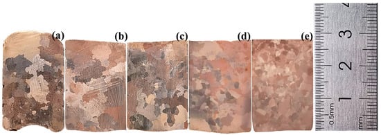 Figure 5 presents the vertical sections of the samples obtained in the gravity coefficient range of 1–1000 and with the temperature decreased from 1200 °C to 900 °C. The solidification structure was mainly composed of coarse crystals in the condition of G = 1, as exhibited in Figure 5a. The solidification structure of Cu-0.5Sn alloy resembled that of a normal gravity field at G = 100, as shown in Figure 5b, albeit with a more uniform crystal size. This was because the convection of the melt increased under supergravity and the melt dissipated heat more uniformly during solidification. However, the convection of the alloy melt caused by the gravitational field under the low gravity coefficient could not overcome the intermolecular forces to produce dendrite fracture. Therefore, the grain size of the alloy was relatively uniform, but it still appeared to be coarse-grained. When the gravity coefficient increased to 300 and 500, the fine grains occupied most of the sample, as shown in Figure 5c,d. Upon further increasing the gravity coefficient to 1000, the grain size of the Cu-0.5Sn alloy was reduced from 4.3 mm to 0.8 mm, and the structure of the alloy was denser and transformed into more uniform equiaxed crystals from coarse crystals. This was due to enhanced convection and heat exchange in the alloy as the gravity coefficient increased. During the solidification process, the breaking of the dendrites created new nucleating particles, so that the grains were refined. Simultaneously, the melt heat dissipation lost its directionality, allowing the nucleus of the crystal to grow freely in the liquid at a rate that was almost the same in all directions. As a result, the shape of the crystals gradually transformed into equiaxed crystals.