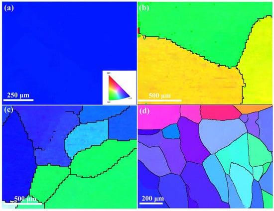 By comparing the microstructures of the alloy grains obtained under normal and supergravity conditions through EBSD, as shown in Figure 7, it is obvious that the alloy grains were refined after the supergravity treatment. The inverse pole figure maps of the as-cast Cu-0.5Sn alloys obtained at G = 1 are shown in Figure 7a, which reveal that only part of the surface of an individual grain was available, and the whole grain could not be observed due to the large grain size. With the gravity coefficient increased to 500, fine grains can be found in the sample, as shown in Figure 7c. Moreover, sub-crystals of smaller grain sizes were formed when the gravity coefficient increased to G = 1000, as depicted in Figure 7d, which further demonstrates the role of supergravity in refining grain size.