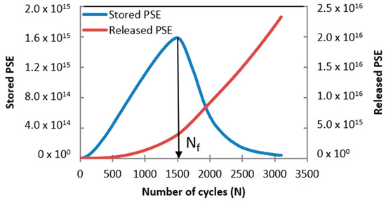 In this study, two variants of were calculated and evaluated: the first was determined by utilizing total released PSE () in terms of the sum of all released PSE () (see Equation (8)) up to the failure occurrence, and the second was calculated by using total released PSE (TRPSE) in terms of the area under the released PSE curve up to failure occurrence (see Equation (10) and Figure 5).