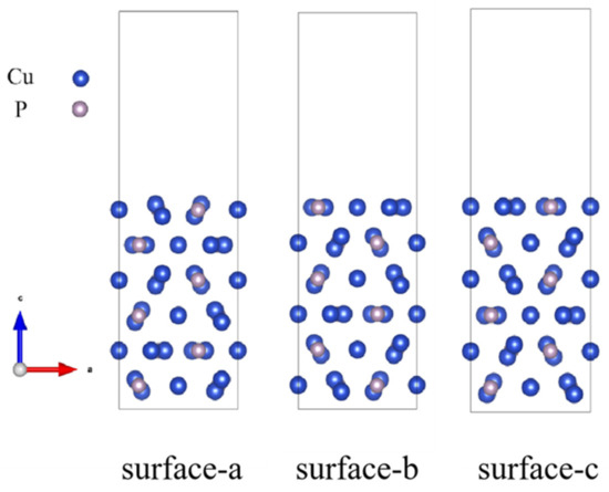 A surface energy calculation is performed for the non-stoichiometric Cu3P (100) surfaces model; this is to confirm the most stable termination for the (100) facet. As shown in Figure 1, three different terminations for the Cu3P (100) surface are obtained by cleaving the geometric optimized bulk Cu3P structure. The surface energy () of these three surfaces was calculated using the following formula [19]: