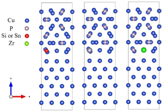 The doped CuP-X/Cu interface model is shown in Figure 4. In the wetting model, the elements (Si, Sn, and Zr) of 2.08% were added into Cu3P. Thus, the two Cu3P (100) interface and (3 × 3 × 1) Cu (100) supercells (102 atoms) were constructed, where an element atom substituted only one atom at different layers.