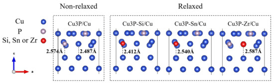 For simplicity, by substituting one site Cu or P atom in bulk Cu3P, the formation energy of doped Si, Sn, and Zr atoms can be calculated by Formula (7) [24], and the calculated results are shown in Table 3.