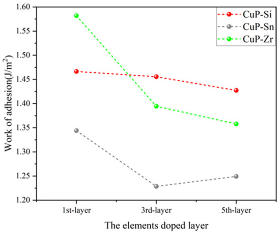 The work of adhesion () of the elements (Si, Sn, and Zr) doped at different layers in CuP/Cu interface structure.