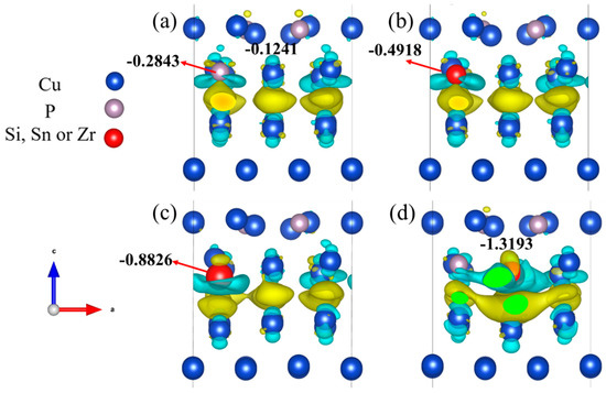 The charge density difference is calculated to better understand the interface interaction between the CuP-X alloys and Cu substrate. The aim is to reveal the ionic bonding between interfacial atomic layers between CuP and Cu before and after the addition of Si, Sn, and Zr elements, as shown in Figure 8. The yellow and blue areas represent enrichment and the loss of electrons in the schematic of charge density difference. The charge depletion around Si, Sn, and Zr atom can be observed in the interface structure after doping (Figure 8a–c), which plays an essential role in forming Si–Cu, Sn-Cu, and Zr-Cu ionic bonds. The quantitative analysis of border partial charge can also reflect this conclusion. Compared with the interface structure before doping (Figure 8a), the charge redistribution between interface atoms becomes more robust after doping. Thus, this results in relatively muscular bonding strength between CuP-X and Cu, indicating that the wettability within the interface increases correspondingly, which is consistent with the calculation of the work of adhesion () in the previous section.