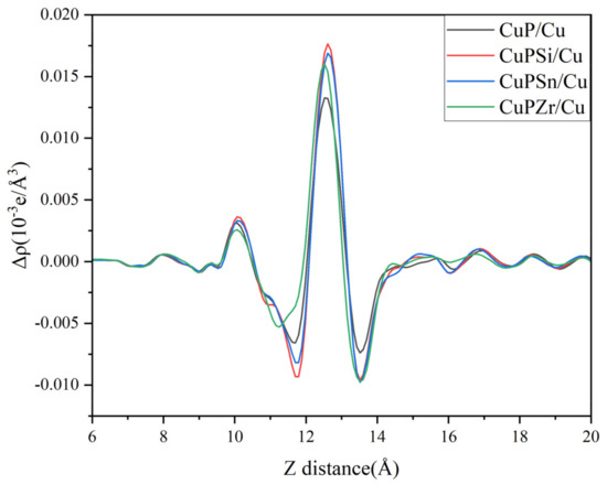 The plane-average electron difference of the CuP-X/Cu interface reflects the quantitative information on charge transfer, as shown in Figure 9. Compared with the Cu3P/Cu interface, there is more obvious charge accumulation in the interface after adding Si, Sn, and Zr, and the charge loss near the CuP-X side is also more obvious, which proves the trend of CuP-X transfer to the interface.