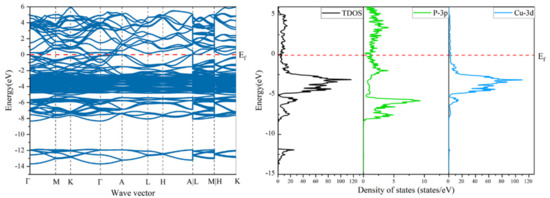 To further illustrate the wettability mechanism between Cu alloys and before and after doping on the surface of CuP, the total density of states (TDOS) and projected density of states (PDOS) of Cu3P, CuP-Si/Cu, CuP-Sn/Cu, and CuP-Zr/Cu interfaces were obtained. Firstly, the band structure and density of states of bulk Cu3P were calculated, as shown in Figure 10. The result of the calculation is close to the result of the previous calculation. Generally, the same electronic structure can be visualized in two different ways: DOS and band structure. Electrons from both the Cu-3d and P-3s states contribute to DOS. The 3s orbital electrons of the P atom on bulk Cu3P majorly occupy the −14 eV~−12 eV region.
