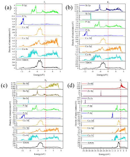 Figure 11 shows a schematic of the changes in the projected density of states (PDOS) of (a) CuP/Cu, (b) CuP-Si/Cu, (c) CuP-Sn/Cu, and (d) CuP-Zr/Cu interface structures. For the CuP-Sn/Cu interface structures, see Figure 10c. It is worth noting that the Cu’s PDOS is not distinguished between Cu3P and Cu substrate, so they belong to the sum of Cu states in Figure 10. The energy of 3p orbital electrons of Cu overlaps with the 4d orbital electron of Sn occupying the same energy band, indicating that the electronic hybridization occurs between 3p orbital electrons of Cu overlaps with the 4d orbital electron of Sn, which enhances the bonding. For the CuP-Zr/Cu interface structures (Figure 11d), 4d orbital electrons of Zr majorly occupy the −7 eV~7 eV region, and the orbitals are relatively broad. The delocalization of 4d orbital electrons of Zr is more evident than that of 3p orbital electrons of Cu; the more substantial the delocalization effect, the better improved the conductivity and the bonding are.