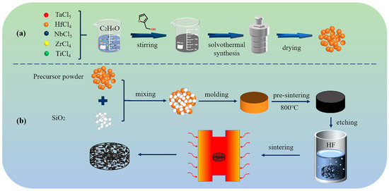 Commercially available tantalum chloride (TaCl5, 99.9%), niobium chloride (NbCl5, 99.9%), titanium chloride (TiCl4, 99.9%), zirconium chloride (ZrCl4, 99.9%), and hafnium chloride (HfCl4, 99.9%) were purchased from Shanghai Aladdin Biochemical Technology Co., Ltd. (Shanghai, China). Furfuryl alcohol (C5H6O2, 99.0%) was employed as the carbon source, and ethanol (C2H6O, analytical reagent) was used as the solvent. Silica microspheres with a diameter of 10 μm were employed as the pore-forming agent.