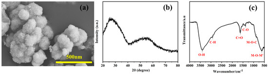 (a) SEM image, (b) XRD pattern, and (c) infrared spectrum of the precursor powder obtained by the solvothermal method.