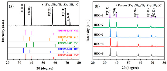 XRD patterns of obtained porous HECs: (a) comparison of HEC-1 sample with various carbides, (b) comparison of different porous HECs with various amount of pore-forming agent.
