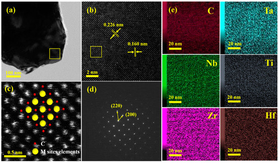 Figure 4a,b show the transmission electron microscopy (TEM) and high-angle annular dark field (HAADF) images of the HEC-1 sample. The HAADF image shows complete and continuous periodic lattice fringes, and the interplanar spacing is measured as 0.226 and 0.160 nm, corresponding to the (200) and (220) planes of the FCC structure. As shown in Figure 4c, since the brightness in the HAADF image is approximately proportional to the square of the atomic number in the periodic table, the bright spot in the image is the location of the transition metal atom with a large atomic number. Moreover, the sample quickly absorbs the light for the C atom with a smaller atomic number, resulting in a black spot at the position of the C atom in the HAADF image. The selected area electron diffraction (SAED) pattern further elaborates the cubic crystal structure of the obtained HEC shown in Figure 4d. Figure 4e is the energy dispersive spectrometry (EDS) map of the yellow border in Figure 4a. The six elements Zr, Hf, Ti, Nb, Ta, and C are uniformly distributed in the material without evident segregation, which further verifies the successful preparation of high-entropy (Ta0.2Nb0.2Ti0.2Zr0.2Hf0.2)C.