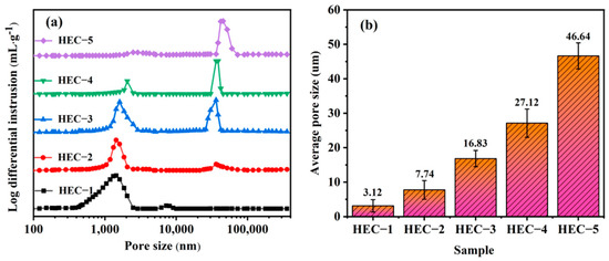 (a) Pore-size distributions and (b) average pore diameters of the porous HECs with the various amounts of pore-forming agent.