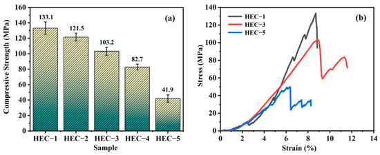 Figure 7a shows the compressive strength of the porous HECs with various porosity values. The compressive strength of the porous HECs decrease with the increase in porosity. Mainly, with the rise of porosity from 23.08% to 59.34%, the compressive strength decreases from 133.1 MPa to 41.9 MPa. Figure 7b shows the typical compressive strain-stress curves of the porous HECs. The HEC-1 sample exhibits a specific brittle fracture characterization, in which the porous ceramic ruptures when the stress surpasses the maximum value. Several zig-zag patterns can be found in the corresponding curve before the rupture, which is attributed to the squashing of the small pores. The rupture of the pores causes cracks that eventually fracture the ceramics. In contrast, the zig-zag pattern occurs after the fracture for both the HEC-3 and HEC-5 samples. The drop in the stress for both the HEC-3 and HEC-5 samples is more significant than that of the HEC-1 sample. The fractures in the HEC-3 and HEC-5 samples mainly respond to the crack propagations among the larger pores. The HEC-5 sample presents a smaller compressive stress, and strain upon fracture. However, the HEC-3 sample shows similar strain and slightly less stress than the HEC-1 sample. The excellent compressive strength is due to the dual-porosity structure of the HEC-3 sample. The small pores can elongate the crack propagation path and enhance the compressive properties.