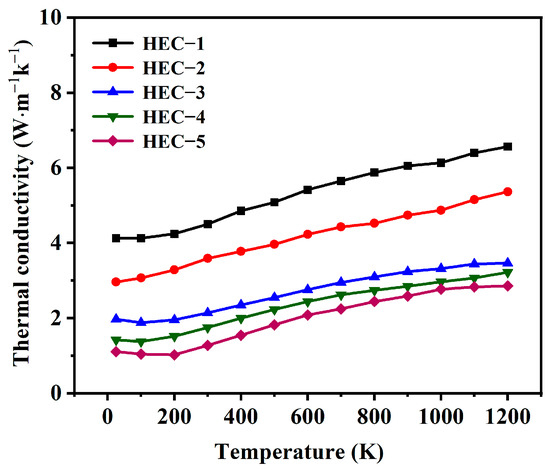 The thermal conductivity of porous HECs with different amounts of the pore-forming agent are shown in Figure 8. It can be seen that porous HECs exhibit low thermal conductivity in the temperature range of 25–1200 °C. The thermal conductivity increases with the increase in temperature. It is known that the heat transfer through lattice vibrations decreases, and convection heat transfer increases with the rise of temperature [20]. The increase in thermal conductivity with temperature indicates that the convection heat transfer is an important heat-transfer mechanism of porous HECs.