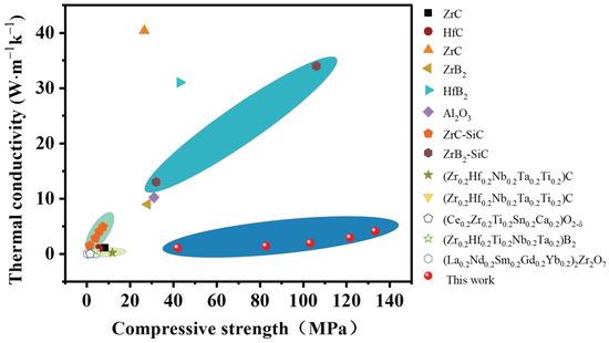 Comparison of the compressive strength and thermal conductivity of the obtained porous HECs with other porous UHTCs from previous reports [18,30,31,43,44,45,46,47,48,49,50,51].