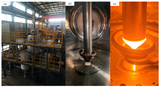 Self-developed EIGA device. (a) EIGA device, (b) melting chamber, and (c) continuous melting.